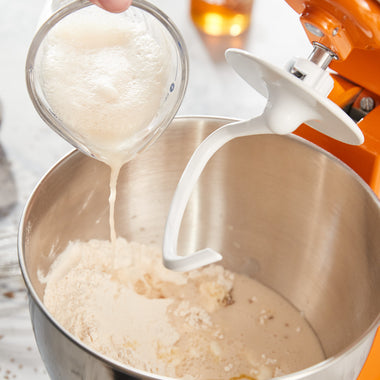 - Add your ingredients to the stand mixer bowl whilst kneading on low speed