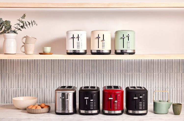 Our design Toaster features a manual lever with high lift functionality which enables you to easily reach small pieces of bread. It has 6 shade settings (so you can easily pick your perfect toasting level) and 5 pre set functions: reheat, defrost, bagel, little longer and cancel. The unique long and slim design makes it perfect for kitchens with smaller bench space.