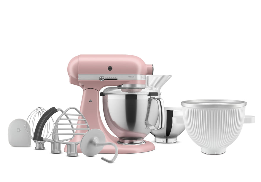 This bundle includes the iconic KSM195 Stand Mixer plus our Ice Cream Bowl Attachment and a premium accessories pack.